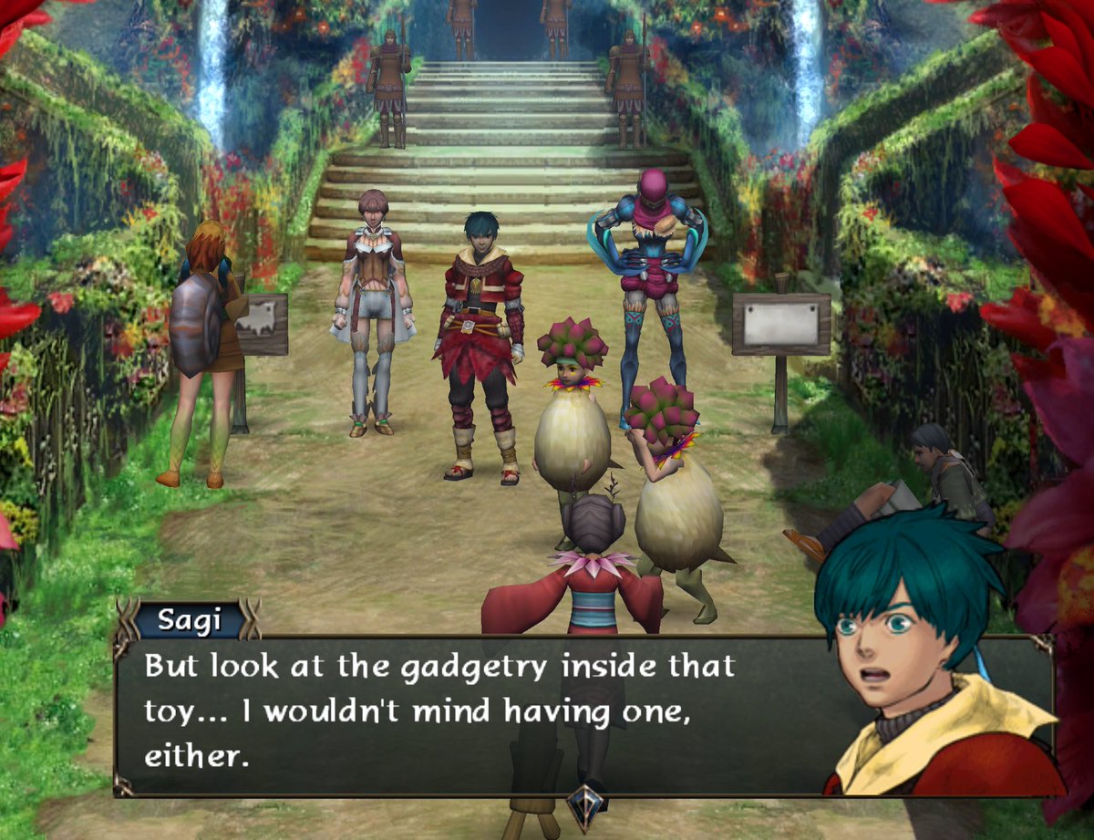 Because subtlety is overrated, leaving the palace sends us into a cutscene with kids testing a contraption and namedropping the maker. CONVENIENT. Also feat bonus Anuenue Corruption Fun