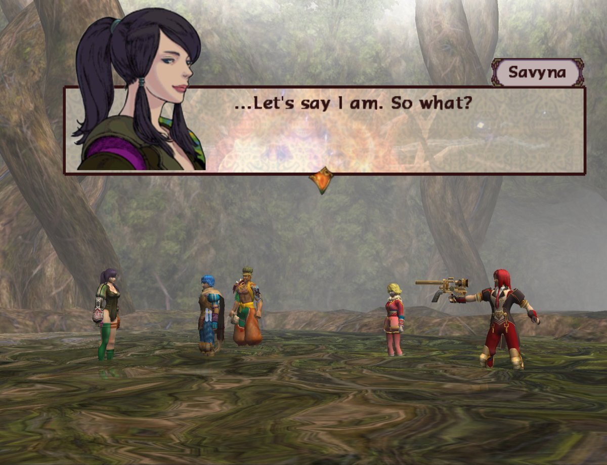 Everyone leaves the tree, Savyna goes on ahead because why wouldn’t she, and our merry crew of goody-two-shoes decides to trust her. Lyude’s voicework strongly emphasizes the “Yeah you do you but I’m still not convinced” vibe the ellipses suggest.