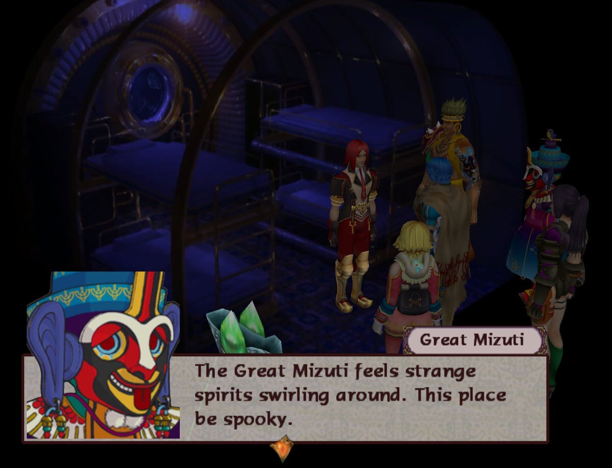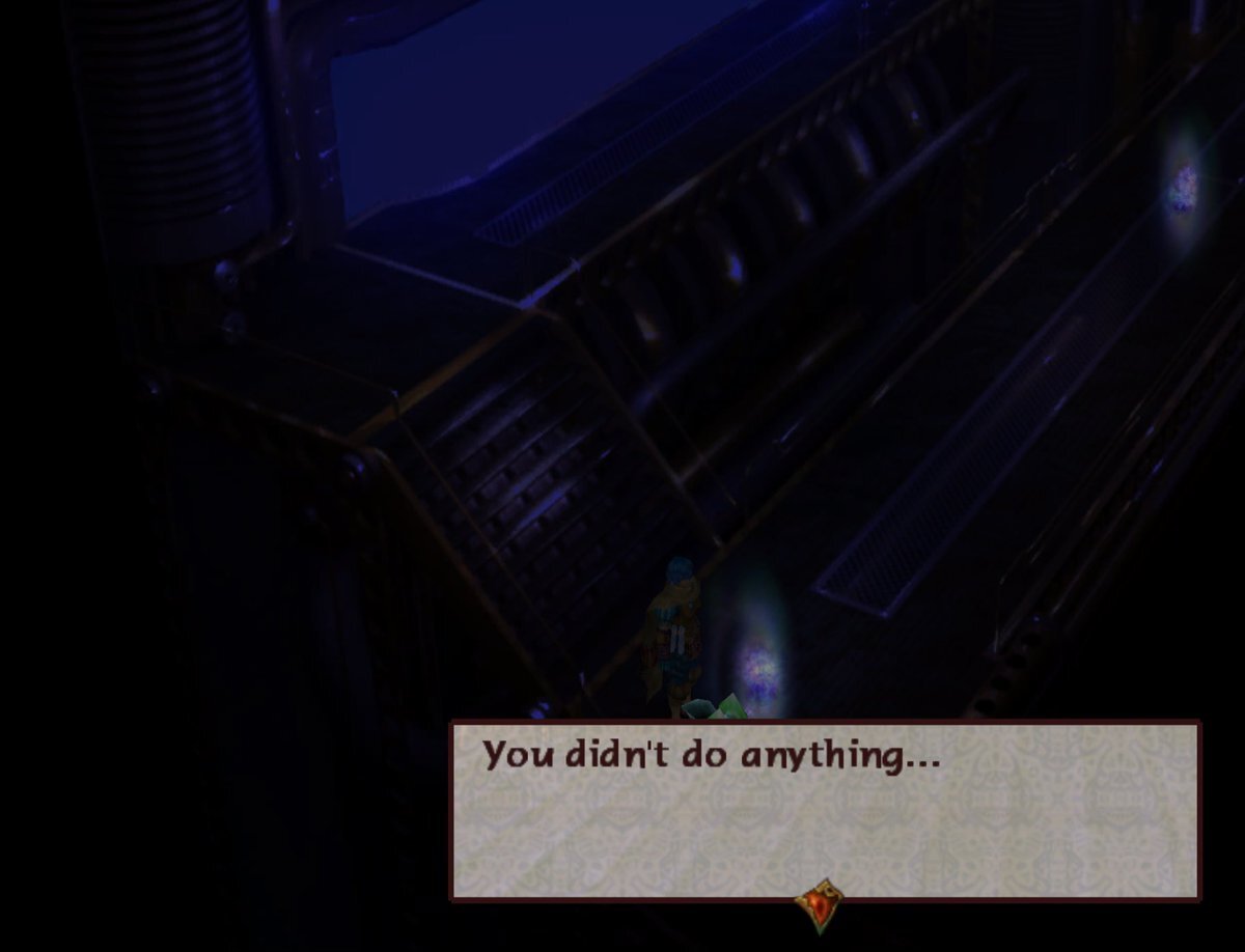 As mentioned by Catranne, there’s a spooky shadowy version of the Goldoba in the Trail of Souls. If we stick around, we end up trapped in there with no way out and no save point. It’s the Goldoba map again but with a heavy blue filter on top. SPOOKY.